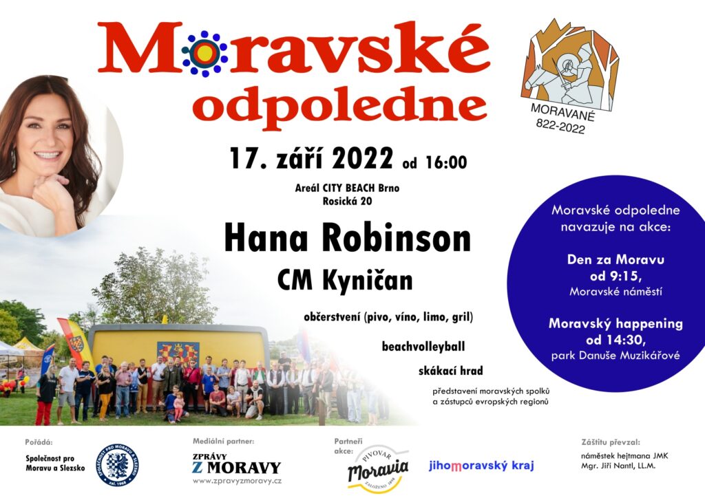 Srdečně zveme na další Moravské odpoledne, 17. září v Brně v areálu City Beach. Přátelské setkání přátel Moravy bude opět plné zábavy pro celou rodinu. Tentokrát navíc na počest 1200 let od první zmínky o Moravanech. Akce je součástí Moravského dne, který začíná dopoledne Dnem za Moravu, pokračuje Moravským happeningem v brzkém odpoledni a vrcholí Moravským odpolednem.